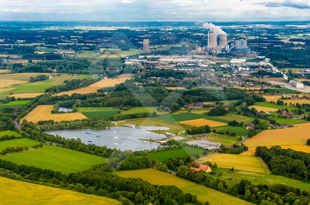 Heute gibt es den Stadtteil Hamm Uentrop aus der Luft. Im Vordergrund seht ihr die Wasserskianlage auf dem Haarener See, im Hintergrund das neue Kraftwerk Westfalen.